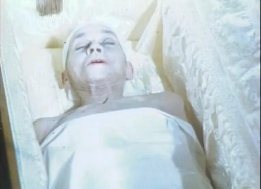 She threatens to haunt the funeral parlor unless they give her the body. They remove her corpse from the slab where the autopsy had already begun with the Y incision. They then lift her into the casket with the body and somehow the two bodies merge back into her “living” self but somehow wearing the surgical garb the corpse wore on the operating table . The body in the surgical gown sits up in the coffin, to a pretty subdued crowd. The Listener literally closes the curtain on the scene.