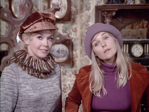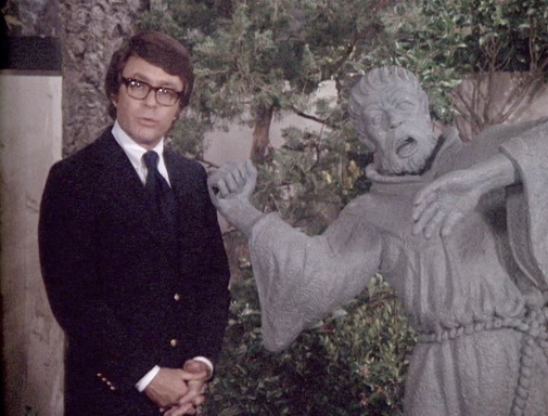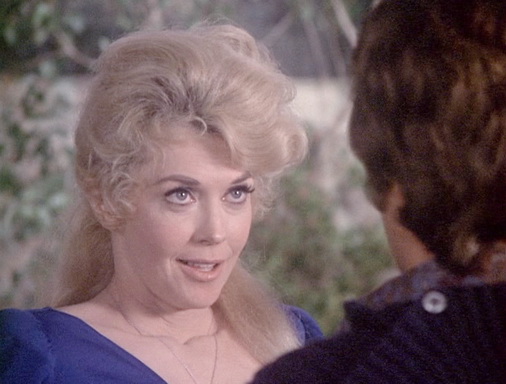 The men find an appropriately alien-looking house. Captain Williams knocks and an appropriately alien-looking woman answers the door. She has a strange purple/bronze skin which doesn’t seem quite right, but it could be the lousy transfer. Her manner of speaking, however, is very effective — very manic and halting. Kudos to whoever came up with it.
