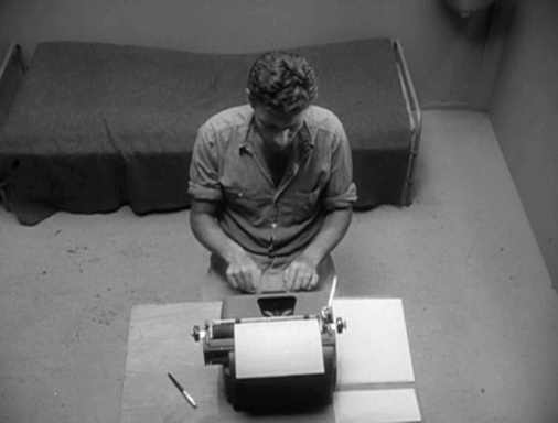 After protesting his innocence of this murder, Daniels requests a typewriter and some paper, pushing his luck with two requests. He begins typing a letter to the editor of The Star Times News (24-hour old news printed on dead trees, for you youngsters).