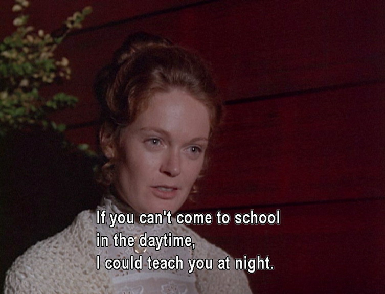 The next night, she is burning the midnight oil again — literally.  Oddly, the same math problems are still on the board behind her and have not been corrected.  Again, the dark boy peers in the widow.  This time, Judith confronts him outside.  She has found that his name is Joel and he has been in the 4th grade for two years.  She offers to teach him at night if he can’t come to class during the day, but he runs off again.