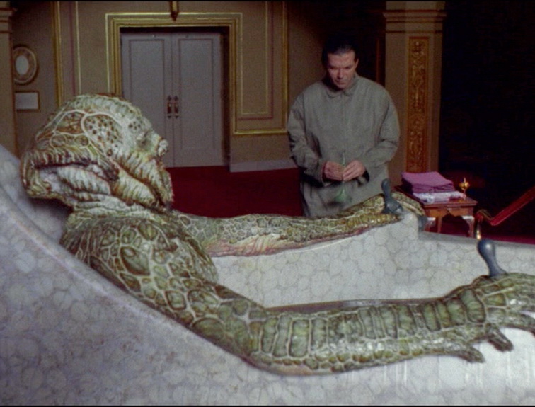 They might be murderous beasts, but they haven’t lost touch with their softer side.  Koltok has 2 human slaves draw him a warm bath in what appears to be the lobby of a hotel.  He then calls for bath oils to go into the viscous goo he bathes in, which already appears to be about 30-weight.  When one of the slaves drops the oil, Koltok slaps him across the room, killing him.