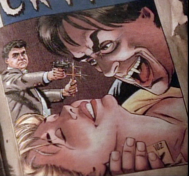 After she leaves, he is filled with self-loathing for about 2 seconds, then raids the vault for fresh blood. On the prowl that night, he just can’t bring himself to attack an old lady, but is OK with attacking a mugger that holds her up. He Heimlichs the mugger dry to replace the blood he stole the night before. Although wouldn’t it have been a lot simpler to go directly to the mugger for his fix, and not drink the blood at the bank?