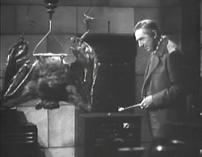 Carruthers (Bela Lugosi) takes a break from pouring liquids from beaker to bottle to duck into the secret bookcase entrance in his lab. He walks down a stone-walled hallway and up the stairs to to a secret-secret bat-nursery where he is raising his little darlings. Hey, Lugosi, enough with the bats!